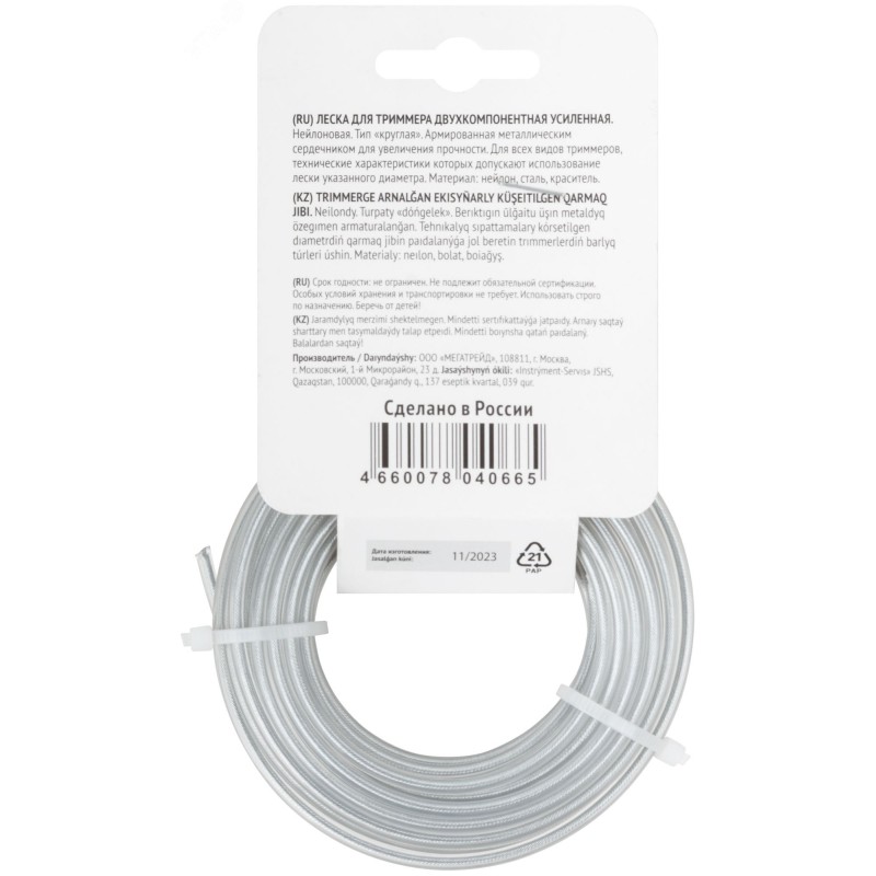 Леска для триммеров повышенной прочности, армированная металлическим сердечником. Материал – нейлон, сталь, краситель. Упаковка – картонный подвес.