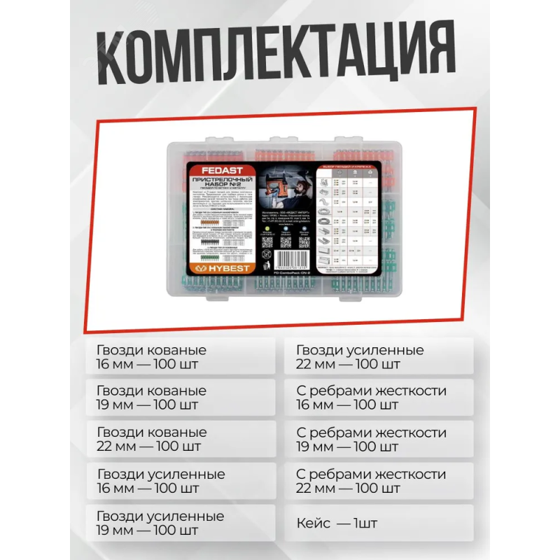 - Преимущества:Разнообразие размеров — набор включает гвозди длины 16, 19, 22 мм, что позволяет подобрать оптимальный крепеж для различных типов работ|Подбор для любых оснований — можно работать с бетонными, кирпичными и металлическими основаниями разной прочности|Удобное хранение — аккуратно упакованы в пластиковую коробку, что делает их легкими для хранения и транспортировки|Совместимость с гвоздезабивными пистолетами — работают с большинством газовых, аккумуляторных и пневматических пистолетов|Устойчивость и надежность — выполнены из качественных материалов, что гарантирует долговечность и прочность соединений