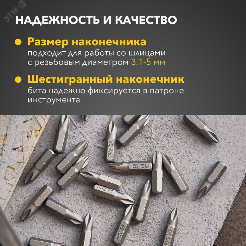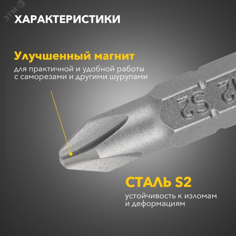 - Преимущества:Бита изготовлена из стали S2|Улучшенная форма биты, эффективная передача вращения крепежу|Улучшенная магнитность биты для более удобной работы с саморезами и другими шурупами|Повышенная твердость стали - высокий ресурс биты