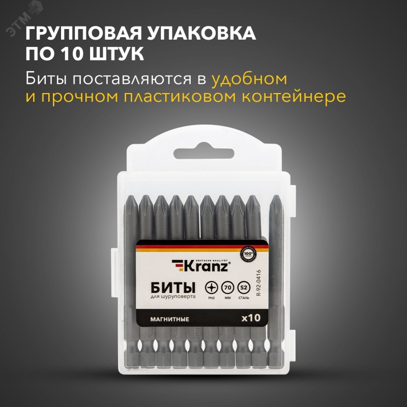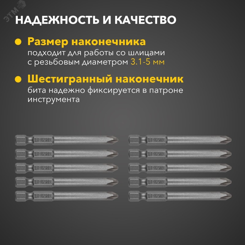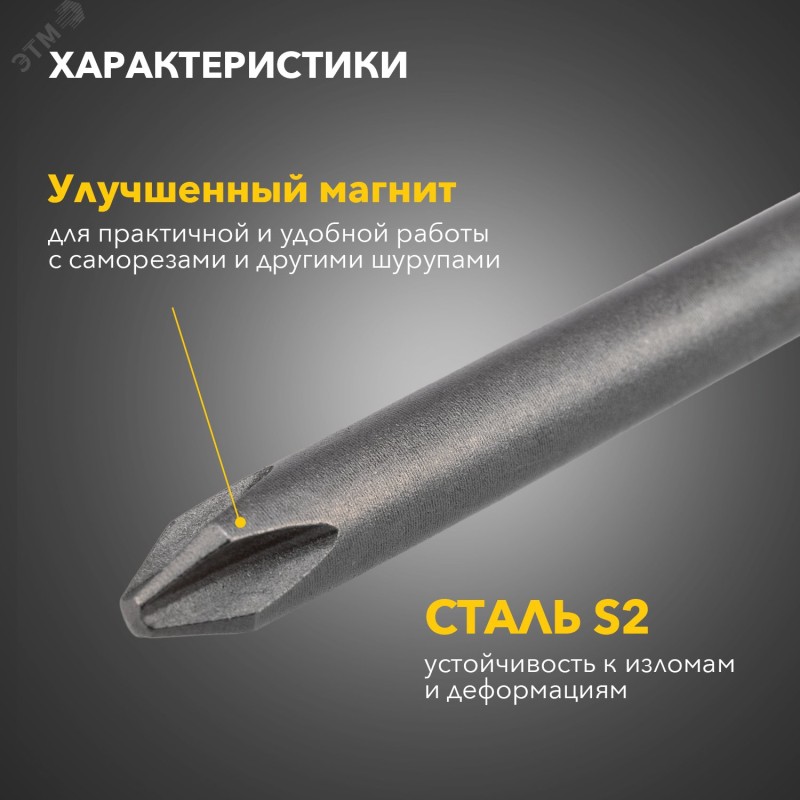 Улучшенная форма биты, эффективная передача вращения крепежу|Улучшенная магнитность биты для более удобной работы с саморезами и другими шурупами|Повышенная твердость стали - высокий ресурс биты