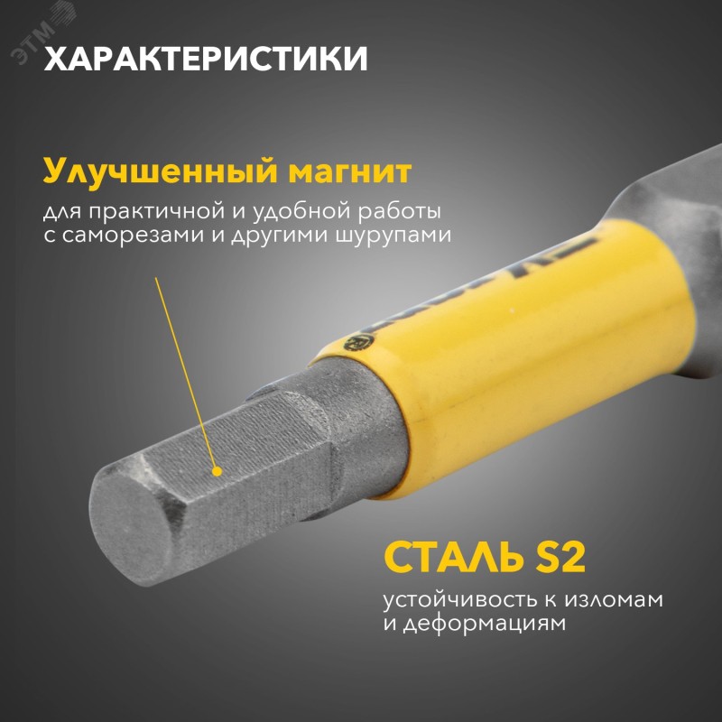 - Преимущества:Улучшенная форма биты, эффективная передача вращения крепежу|Улучшенная магнитность биты для более удобной работы с саморезами и другими шурупами|Повышенная твердость стали - высокий ресурс биты