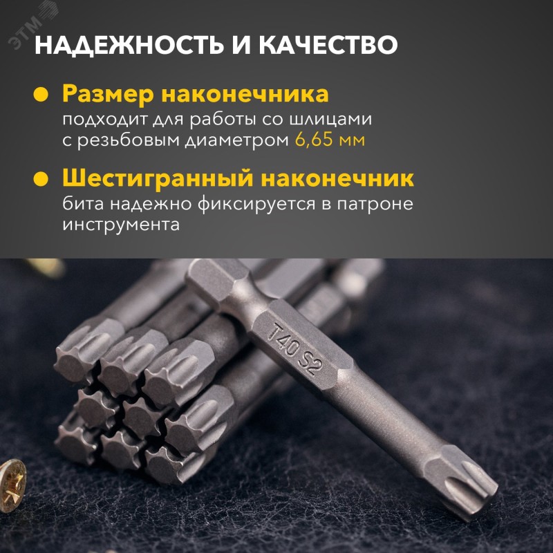 Бита T-40 используется в качестве сменной насадки на шуруповерт или отвертку-адаптер для работы с крепежом типа Torx. Изготовлена из легированной высокопрочной стали S2, что дает повышенную устойчивость к изломам и деформации в наиболее нагружаемых точках касания. Размер наконечника T-40 подходит для работы со шлицами с резьбовым диаметром 6,65 мм. Намагниченный наконечник облегчает крепление и фиксацию крепежа на бите. Шестигранный хвостовик надежно фиксирует биту в патроне инструмента и не дает ей проворачиваться. Благодаря хвостовику такая бита подойдет для установки на все виды шуруповертов и отверток-адаптеров.