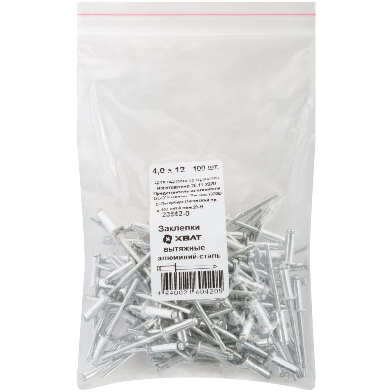 Заклепка вытяжная комбинированная со стандартным бортиком. Перед монтажом заклепки необходимо предварительно просверлить отверстие сверлом, соответствующим диаметру заклепки. В процессе монтажа стержень подтягивает за собой втулку, что позволяет плотно соединить скрепляемые детали. Лишний стержень откусывается.