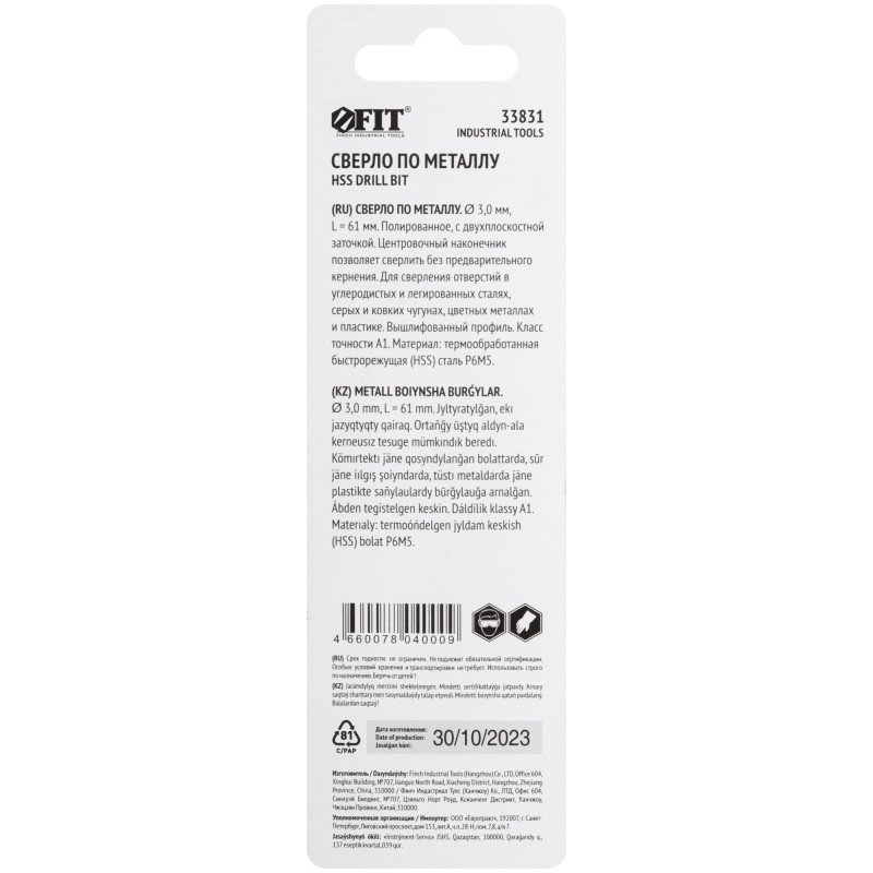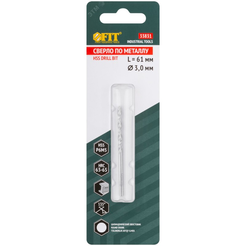Сверла по металлу FIT IT предназначены для сверления отверстий в углеродистых и легированных сталях, серых и ковких чугунах, цветных металлах и пластике. Центровочный наконечник с крестообразной подточкой обеспечивает возможность сверления без предварительного кернения. Режущие усилия распределяются равномерно за счет угла заточки 135 градусов. Сверла имеют высший класс точности А1 и высверливают отверстия с точным диаметром. Сверла изготавливаются методом вышлифовки профиля, что повышает плавность сверления и чистоту готовых отверстий. Форма спирали соответствует стандарту DIN 338 и способствует эффективному удалению стружки во время работы.