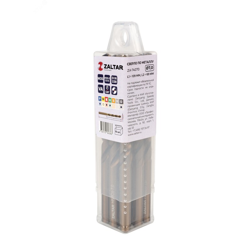 - Дополнительная информация:количество в наборе, шт - 10|технический стандарт - DIN 338|материал - HSS-E Co5|тип сверла - VA|диаметр сверла, мм - 7.0|рабочая длина, мм - 69|длина, мм - 109|глубина реза - 5xD|угол заточки, градусов - 130|угол спирали, градусов - 36|тип хвостовика - цилиндрический|тип заточки - DIN1412-C - крестообразная подточка перемычки