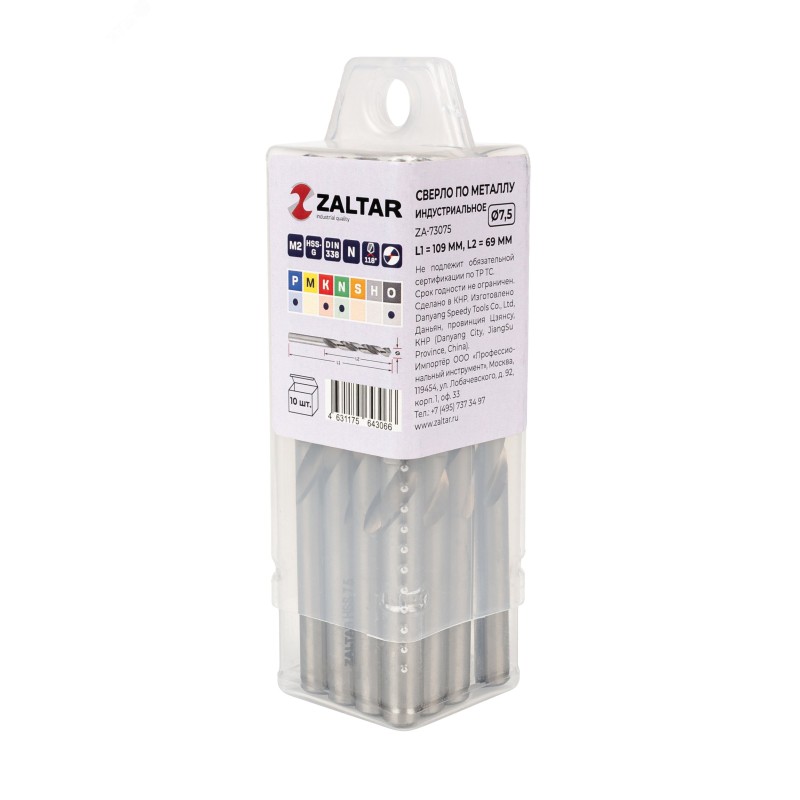 - Дополнительная информация:количество в наборе, шт - 10|технический стандарт - DIN 338|материал - HSS-G|тип сверла - N|диаметр сверла, мм - 7.5|рабочая длина, мм - 69|длина, мм - 109|глубина реза - 5xD|угол заточки - 118 градусов|угол спирали - 25-30 градусов|тип хвостовика - цилиндрический|тип заточки - DIN1412-C - крестообразная подточка перемычки