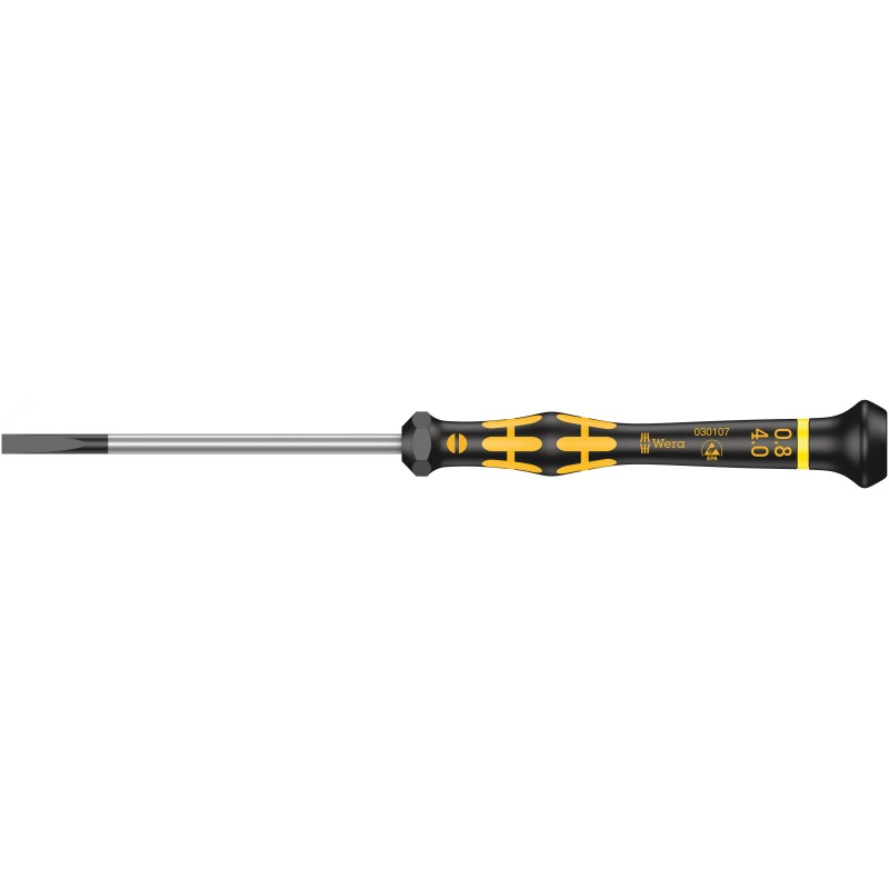 - Преимущества:Шлицевая отвёртка Kraftform Micro|Электростатически безопасный инструмент из-за поверхностного сопротивления 10 Ом|Многокомпонентная ручка Kraftform Micro для быстрого и эргономичного завинчивания|Наконечник Wera Black Point обеспечивает точность работы и оптимальную защиту от коррозии|С индикатором Take it easy - Цветовая маркировка профиля и гравировка размера
