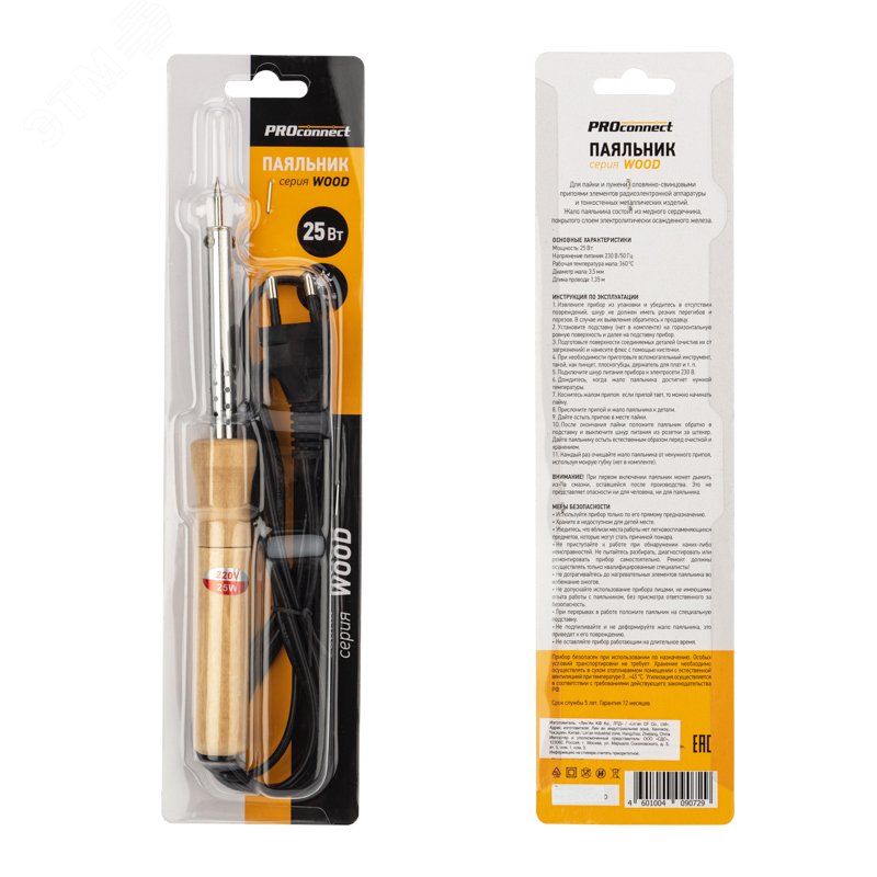 Электрический паяльник с деревянной ручкой и конусообразным жалом непрерывного нагрева предназначен для монтажной пайки и лужения оловянно-свинцовыми припоями элементов радиоэлектронной аппаратуры и тонкостенных металлических изделий в производственных и бытовых условиях. Перед началом эксплуатации электрического паяльника паяльное жало следует подвергнуть лужению. Напряжение питания - 220-230 В 50/60 Гц. Потребляемая мощность - 25 Вт. Длина провода - 1.35 м Масса - 0.13 кг.
