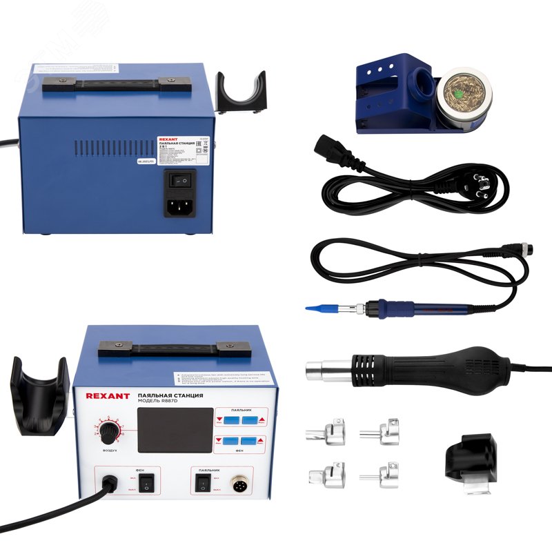 - Комплектация:основной блок|термофен|паяльник|держатель паяльника|держатель термофена|губка для очистки жала паяльника (в ложементе)|насадки для термофена 5, 8, 10, 13 мм|руководство по эксплуатации|упаковка