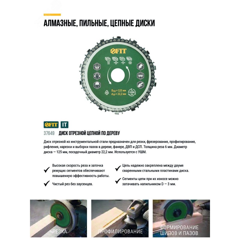 - Преимущества:Диск обладает широким спектром применения|Высокая прочность и заточка режущих сегментов обеспечивают высокую эффективность работы и чистоту реза|Цепь надежно закреплена между двумя стальными пластинами диска|Сегменты цепи возможно затачивать напильником D