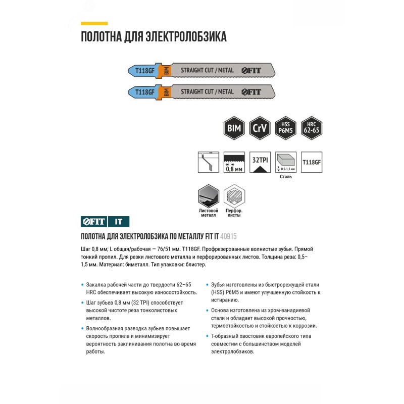 Шаг 0,8 мм, L общая/рабочая — 76/51 мм. T118GF. Профрезерованные волнистые зубья. Прямой тонкий пропил. Для резки листового металла и перфорированных листов. Толщина реза - 0,5–1,5 мм. Материал - биметалл. Закалка рабочей части до твердости 62–65 HRC обеспечивает высокую износостойкость. Шаг зубьев 0,8 мм (32 TPI) способствует высокой чистоте реза тонколистовых металлов. Волнообразная разводка зубьев повышает скорость пропила и минимизирует вероятность заклинивания полотна во время работы. Зубья изготовлены из быстрорежущей стали (HSS) Р6М5 и имеют улучшенную стойкость к истиранию. Основа изготовлена из хром-ванадиевой стали и обладает высокой прочностью, термостойкостью и стойкостью к коррозии. Т-образный хвостовик европейского типа совместим с большинством моделей электролобзиков.