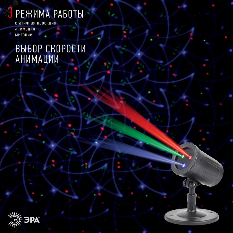 Лазерный проектор `Калейдоскоп`. В комплект входит пульт дистанционного управления. Линии, точки, завитки и фигуры взаимодействуют друг с другом, создавая в помещении неповторимую атмосферу. Применять проектор ЭРА можно и на улице, он защищён от влаги и пыли, устойчив к морозам. В зависимости от скорости анимации, меняется настроение - проектор подходит как для медитации или уютного тихого вечера дома, так и для шумной вечеринки с танцами. В наборе 2 подставки: заострённая ножка для установки в снег или грунт + широкое основание для горизонтальной поверхности. Есть пазы для подвешивания на стену. Корпус из ударопрочного пластика. Работает прибор от стандартной сети 220 В. Шнур длиной 5 метров позволяет использовать проектор на значительном расстоянии от электросети. Специальный соединительный разъём даёт возможность дополнительно наращивать провод при помощи удлинителей.