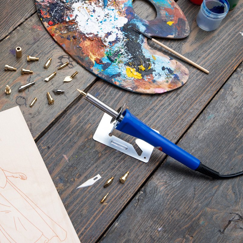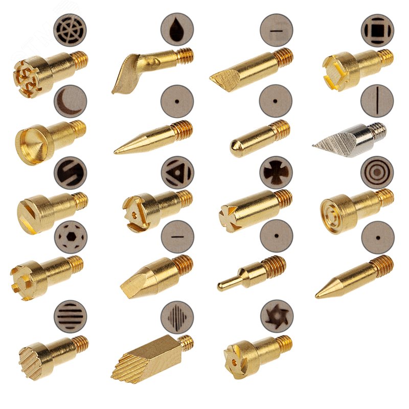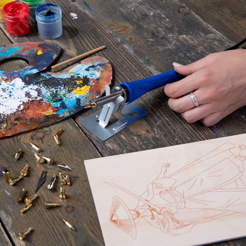 Паяльник-выжигатель с набором насадок REXANT представляет отличное решение для тех, кто стремится по максимуму использовать полезные приборы. Благодаря различным насадкам (21 шт) устройство можно использовать в качестве паяльника, горячего ножа и выжигателя. С помощью этих насадок можно создавать красивые картины, выжигая на дереве различные узоры, выполнять выжигание на изделиях из кожи, резать пластмассу, вырезать на воске или пенопласте и т.п. Все насадки закрепляются с помощью резьбового соединения. В комплект входит – паяльник, жало для пайки, выжигательные насадки 19 шт., насадка-нож с цанговым зажимом, металлическая подставка.