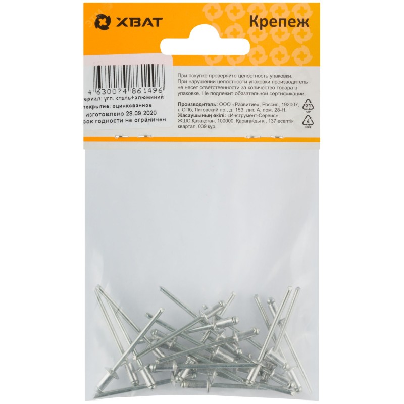 Заклепка вытяжная комбинированная со стандартным бортиком. Перед монтажом заклепки необходимо предварительно просверлить отверстие сверлом, соответствующим диаметру заклепки. В процессе монтажа стержень подтягивает за собой втулку, что позволяет плотно соединить скрепляемые детали. Лишний стержень откусывается.