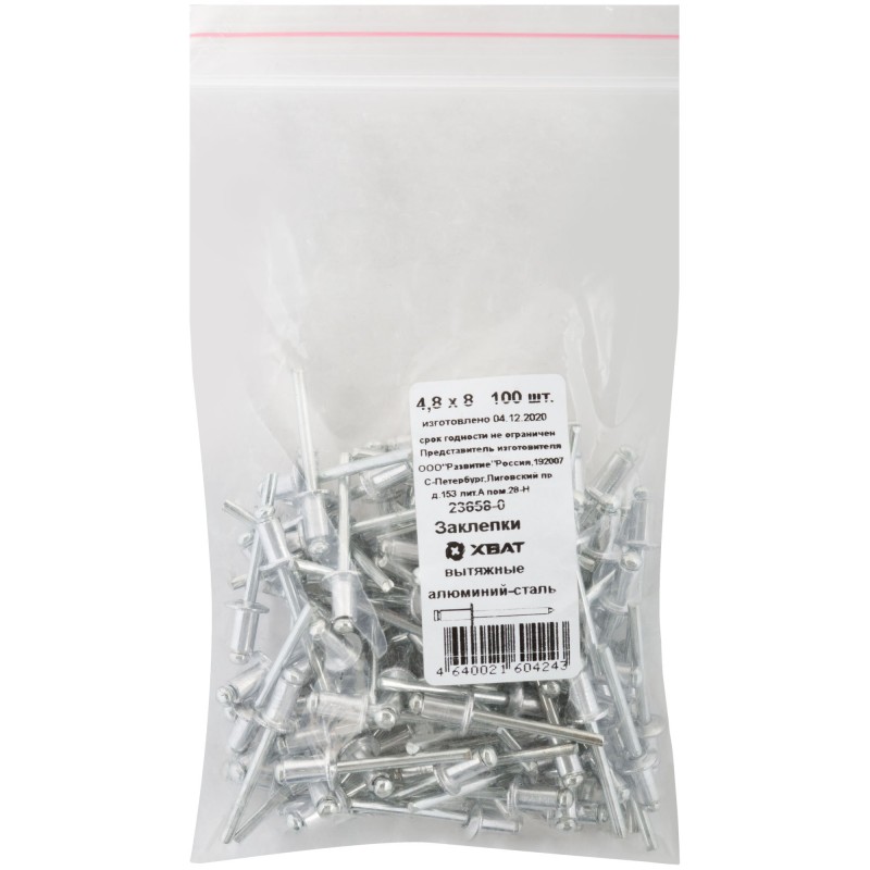 Заклепка вытяжная комбинированная со стандартным бортиком. Перед монтажом заклепки необходимо предварительно просверлить отверстие сверлом, соответствующим диаметру заклепки. В процессе монтажа стержень подтягивает за собой втулку, что позволяет плотно соединить скрепляемые детали. Лишний стержень откусывается.