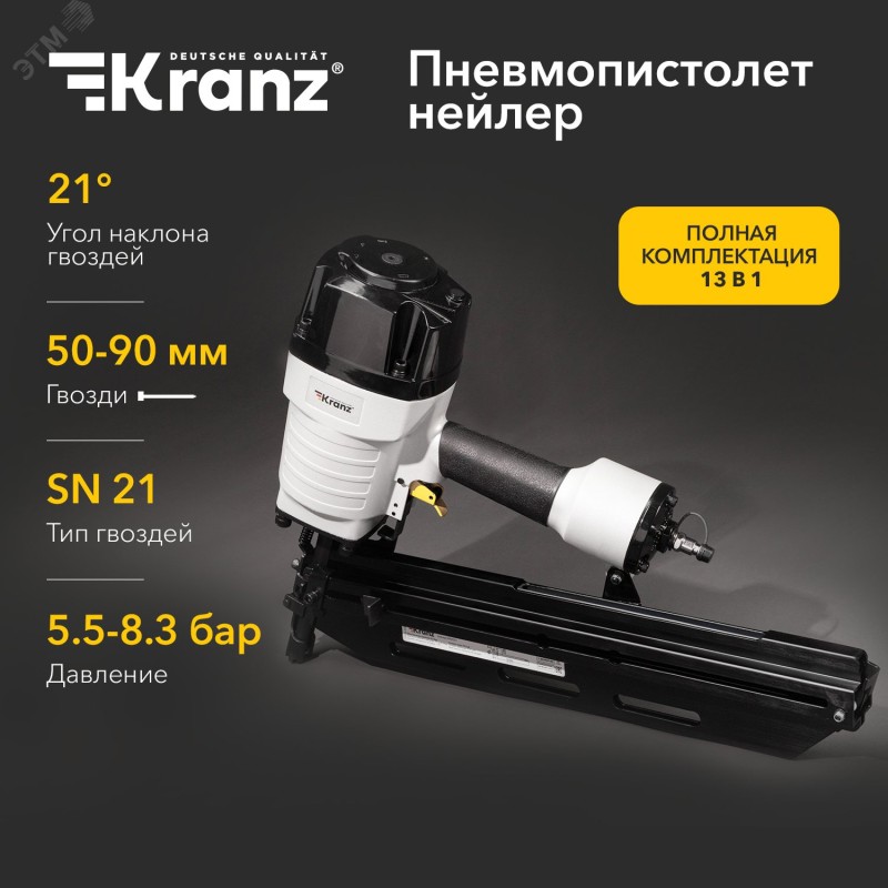 - Дополнительная информация:рабочее давление – от 5,5 до 8,3 Бар|расход воздуха на удар – 3 литра в минуту|тип гвоздей – SN21