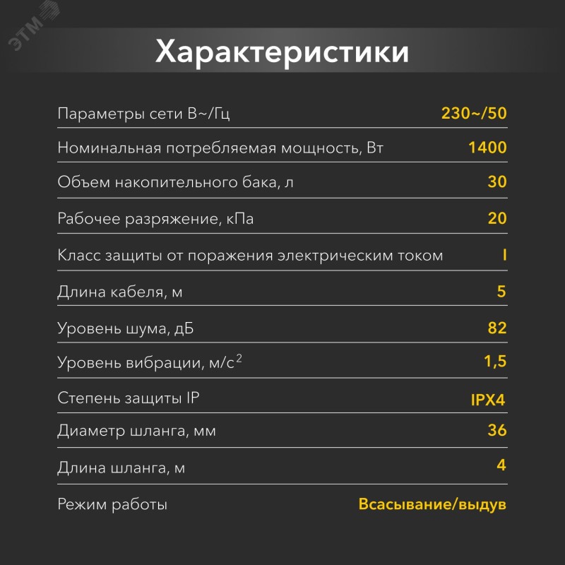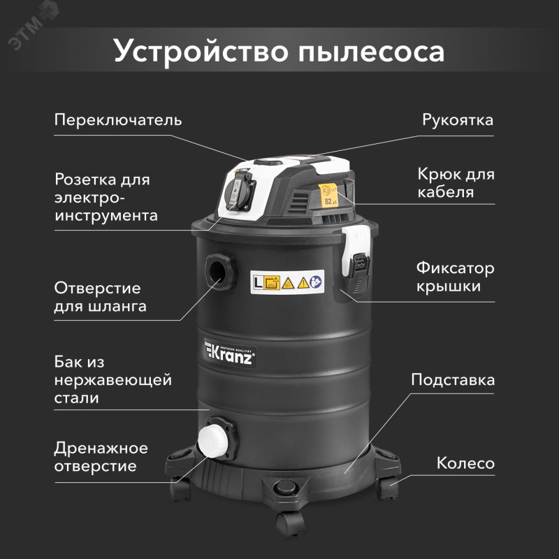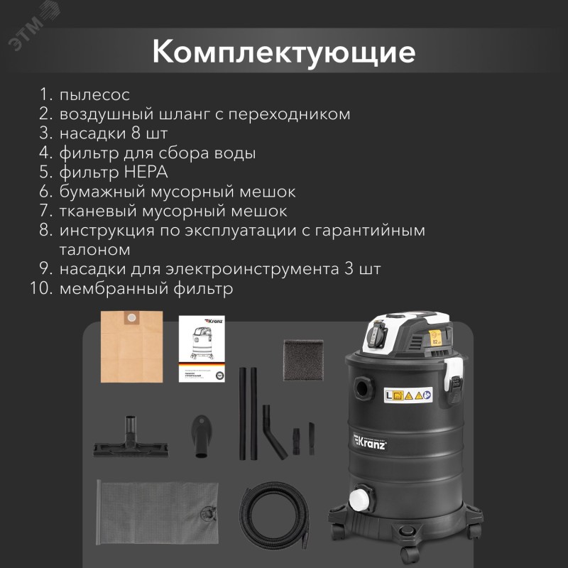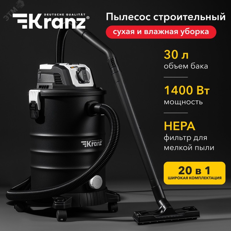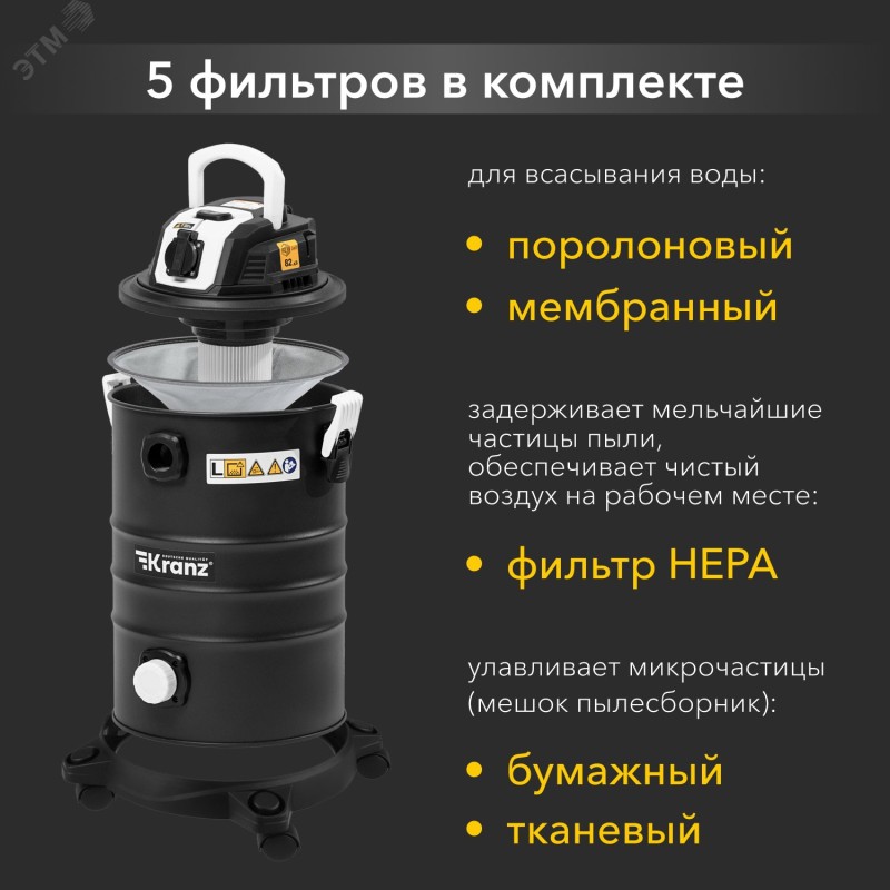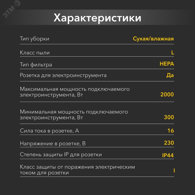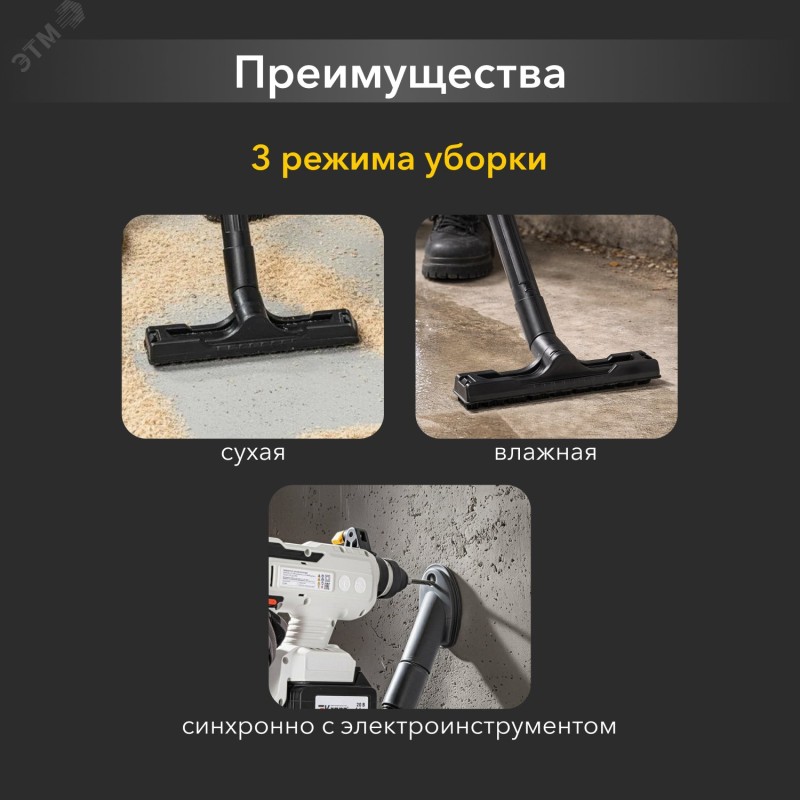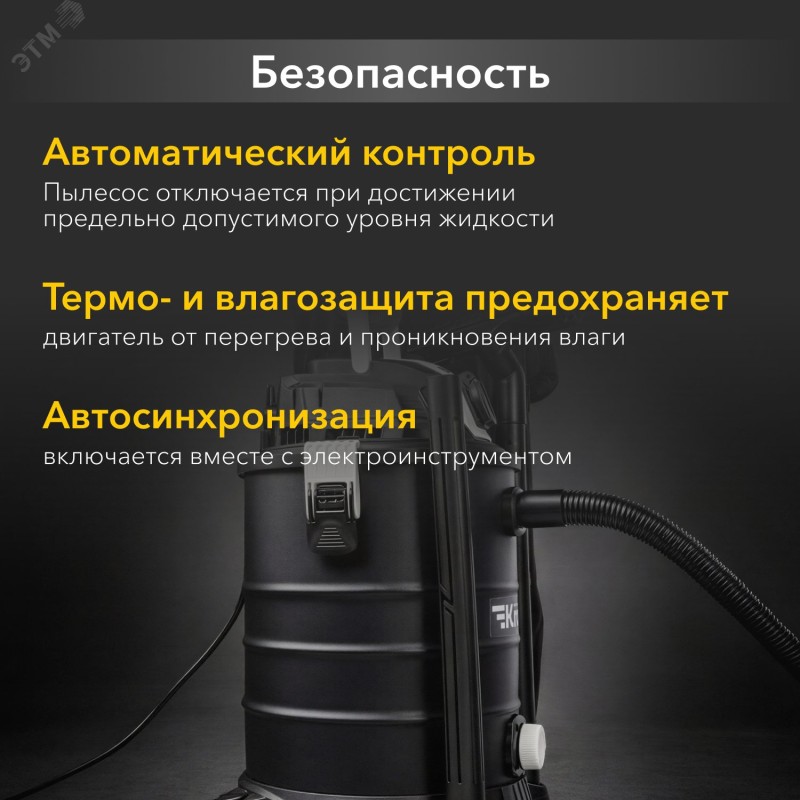 - Преимущества:Функция синхронизации с инструментами для сбора мусора сразу во время работы|Производительный двигатель помогает эффективно и быстро справляться со сложными загрязнениями|Удлиненный шланг позволяет свободно перемещаться и доставать до труднодоступных мест|Термо- и влагозащита - пылесос сохраняет надежность при уборке жидкостей и длительной работе|Адаптируется под любую задачу - в комплекте множество различных насадок|Фильтр тонкой очистки HEPA эффективно задерживает пыль и аллергены|Автоматический контроль уровня жидкости - пылесос отключится при достижении максимума