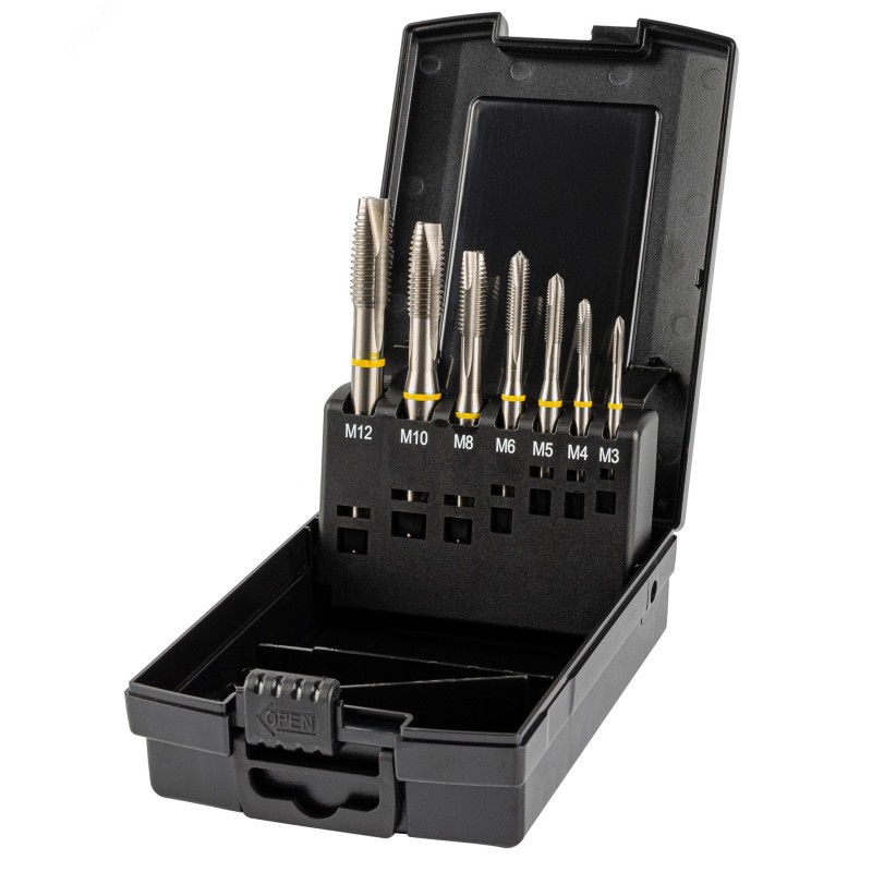 - Дополнительная информация:количество в наборе, шт - 7|технический стандарт - DIN 371 и DIN 376|материал - HSS-E|тип резьбы - M - метрическая|размер резьбы - M3 / M4 / M5 / M6 / M8 / M10 / M12|допуск - 6H|направление резьбы - правое|угол резьбы - 60 градусов|тип машинного метчика - тип B|тип стружечной канавки - прямой|для сквозных отверстий