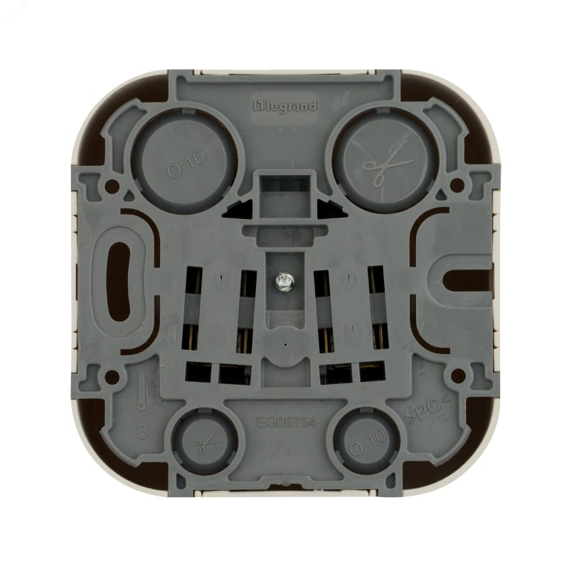- Преимущества:Современный формат накладного монтажа|Механизм изготовлен из высококачественного поликарбоната, не проводит электрический ток, не поддерживает горение|Простое выравнивание изделий при установке в ряд, благодаря специальной форме основания|Корпус ударопрочный из пластичного полипропилена, стойкого к внешним воздействиям|Перфорация на корпусе для безошибочного вырезания отверстий при монтаже открытой проводки|В основании преднарезаны 4 отверстия для подвода кабеля при монтаже скрытой проводки