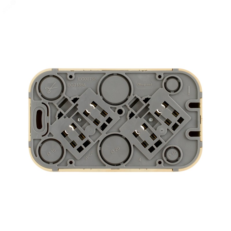 - Преимущества:Современный формат накладного монтажа|Механизм изготовлен из высококачественного поликарбоната, не проводит электрический ток, не поддерживает горение|Простое выравнивание изделий при установке в ряд, благодаря специальной форме основания|Корпус ударопрочный из пластичного полипропилена, стойкого к внешним воздействиям|Перфорация на корпусе для безошибочного вырезания отверстий при монтаже открытой проводки|В основании преднарезаны 4 отверстия для подвода кабеля при монтаже скрытой проводки