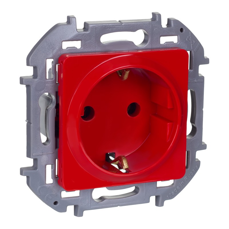 Розетка с заземлением, с защитными шторками для скрытого монтажа Inspiria, цвет ''Красный'', максимальный ток 16А, напряжение ~250В, максимальная мощность 3680Вт, винтовые зажимы. Применяется для присоединения однофазных электрических потребителей к сети переменного тока в зданиях с проводкой с заземлением (с защитным проводником).