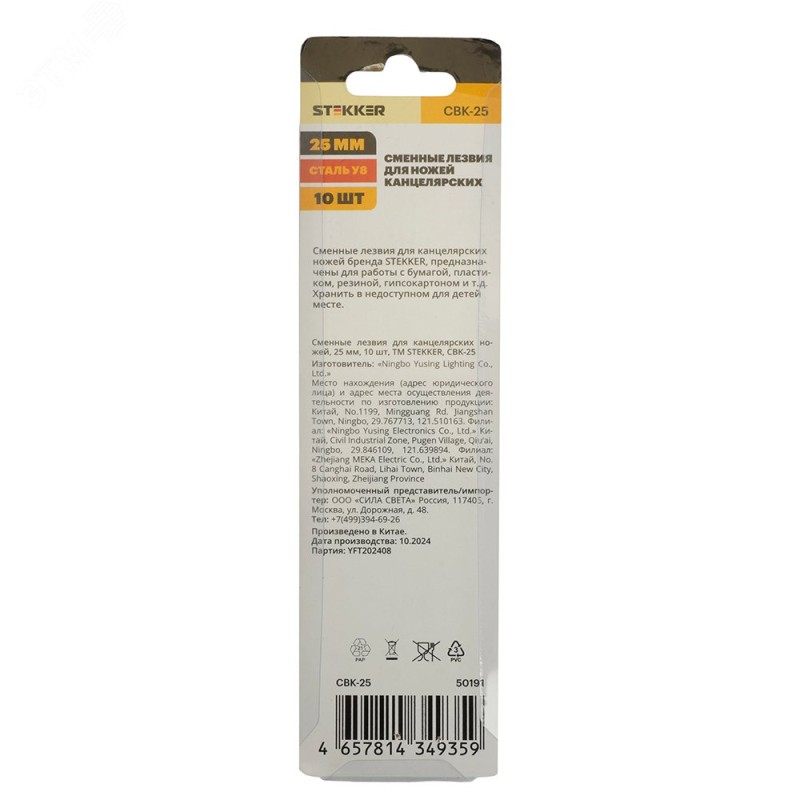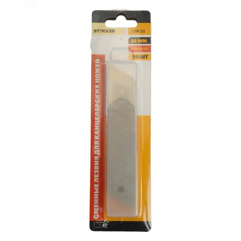 CBK-25 Сменные лезвия для канцелярских ножей, блистер, 25 мм, 10 шт., STEKKER. Сменные лезвия предназначены для канцелярских ножей, которые используются при работе с бумагой, пластиком, резиной, гипсокартоном. Лезвия выполнены из стали У8, ширина лезвия 25 мм. В комплект входит 10 лезвий. Длина лезвия - 125 мм.