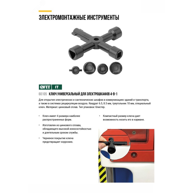 Ключ универсальный для электрошкафов 4-в-1 FIT IT предназначен для открытия электрических и сантехнических шкафов, в коммуникациях зданий и транспорта, а также в системах рециркуляции воздуха. Ключ имеет 4 размера наиболее распространенных форм. Изготовлен из цинкового сплава, обладающего высокой износостойкостью и длительным сроком службы. Черненое покрытие ключа предотвращает коррозию. Компактный размер ключа дает возможность носить его в кармане.