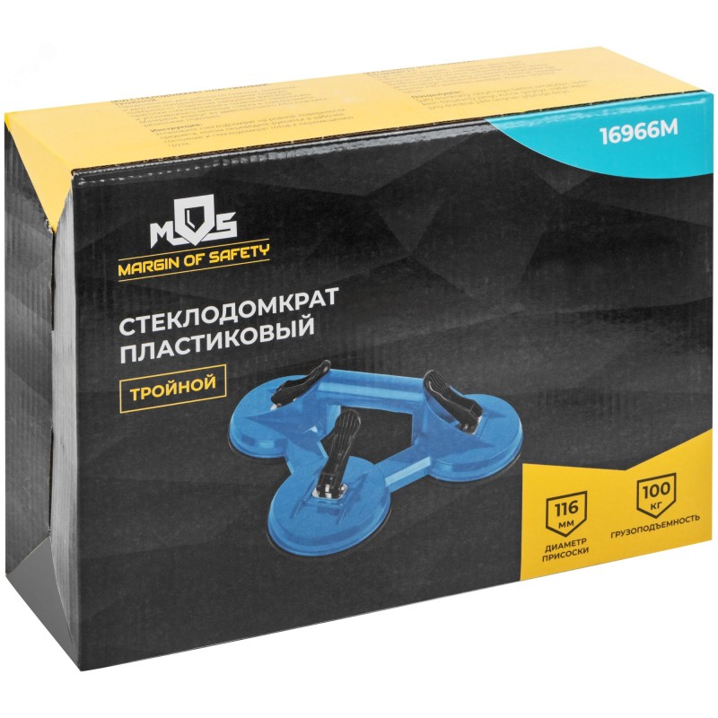 Пластиковый, тройной. Предназначен для работы со стеклом, металлом и другими материалами имеющими гладкую поверхность. Надежная вакуумная фиксация присоски стеклодомкрата позволяет переносить и устанавливать оконные стекла и стеклопакеты. Максимальная грузоподъемность до 100 кг. Материал - корпус из ударопрочного ABS пластика, резиновая подошва. Упаковка - картонная коробка.