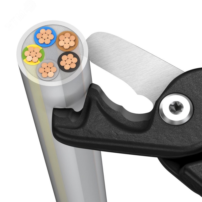 - Преимущества:Простое управление одной или двумя руками с минимальным раскрытием рукоятки для кабелей большого диаметра|Регулируемый болтовой шарнир с высоким рычажным усилием обеспечивает точную и плавную резку|Тонкая головка для облегчения доступа|Защита от защемления пальцев|Не подходит для кабелей, армированных сталью, например сталеалюминиевого провода|Режущие кромки дополнительно закалены лазером, твердость режущей кромки составляет прибл. 56 HRC