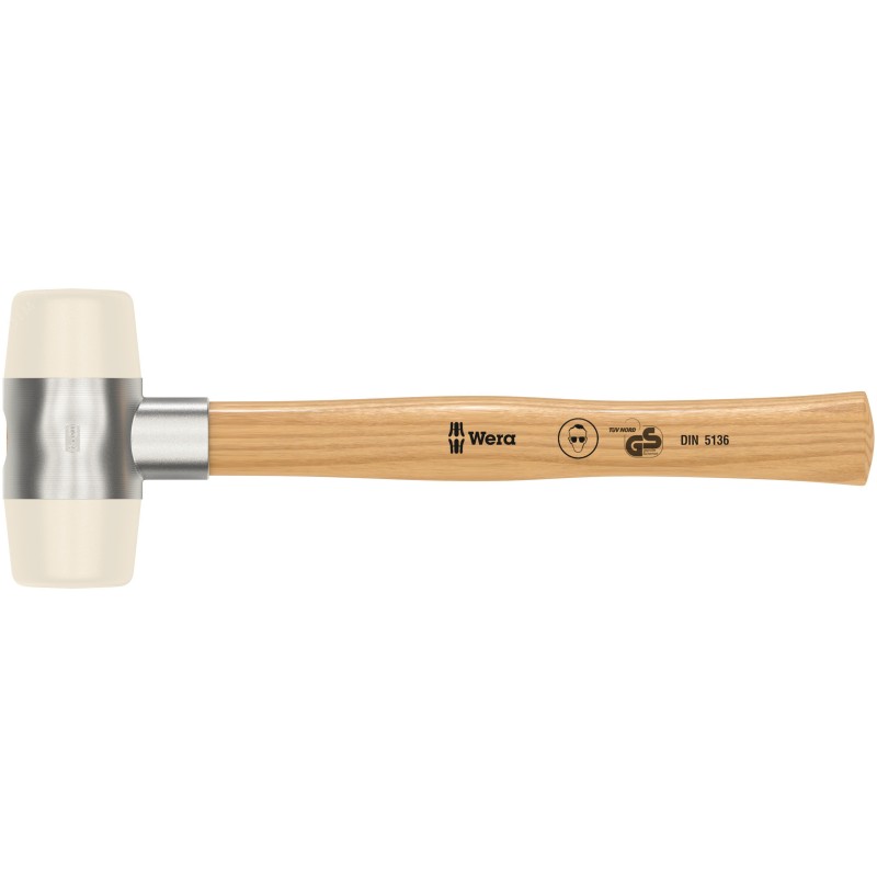 Молоток с мягкими бойками Wera - конструкция с клином в форме двустороннего конуса для надёжного неразъёмного соединения головки и ручки молотка. Головка молотка из нейлона. Ручка из высококачественного ясеня. Разные варианты применения за счёт переоснащения головки молотка. Для работ по жести, монтажа, возведения палаток, павильонов, выставочных стендов.