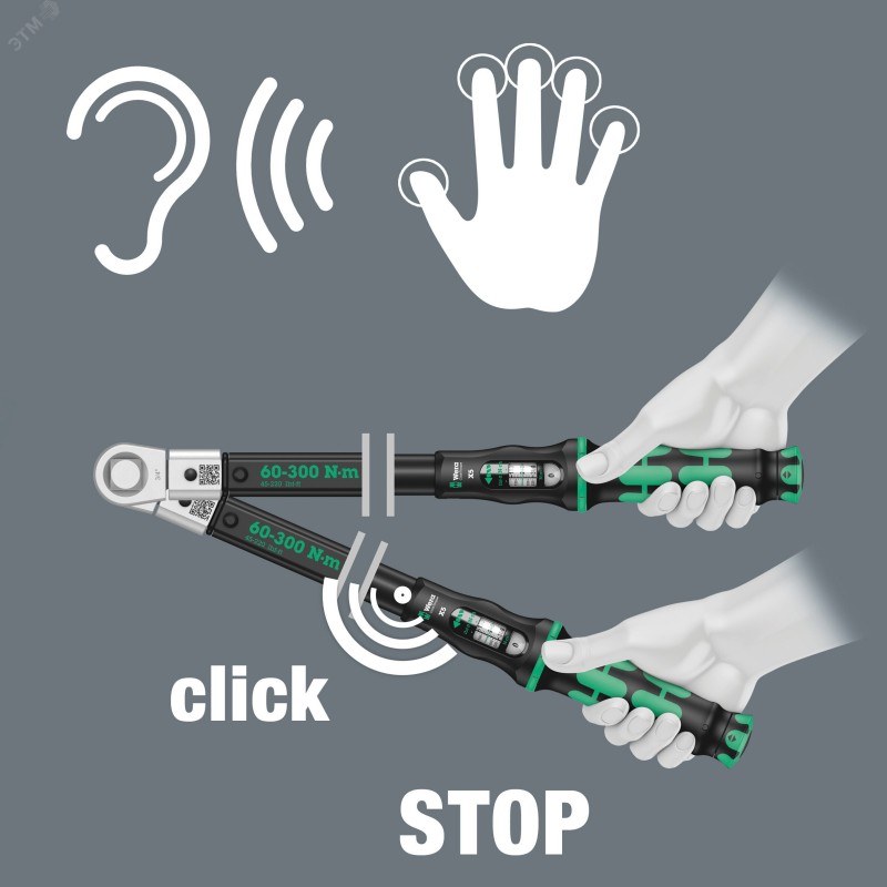 C приёмным гнездом для сменных инструментов 14x18 мм|Простая установка и защита от сбоя установленного значения момента, слышимые и ощущаемые щелчки для каждого значения|Слышимая и ощущаемая разблокировка при достижении установленного момента силы|Диапазон измерения - 60-300 Nm, погрешность ± 3 процентов согласно DIN EN ISO 6789-1 -2017-07|Очень добротное исполнение, с эргономичной двухкомпонентной ручкой, подходит для правой и левой затяжки