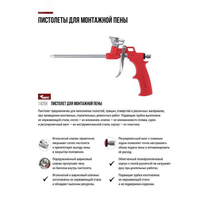 Регулятор подачи пены обеспечивает необходимое дозирование и способствует оптимизации ее расхода|Игольчатый и шариковый клапаны изготовлены из нержавеющей стали и обладает высоким ресурсом|Облегченный полипропиленовый корпус не нагружает руку при длительных работах|Подающая трубка изготовлена из нержавеющей стали, не подверженной коррозии|Эргономичная рукоятка имеет широкие упоры