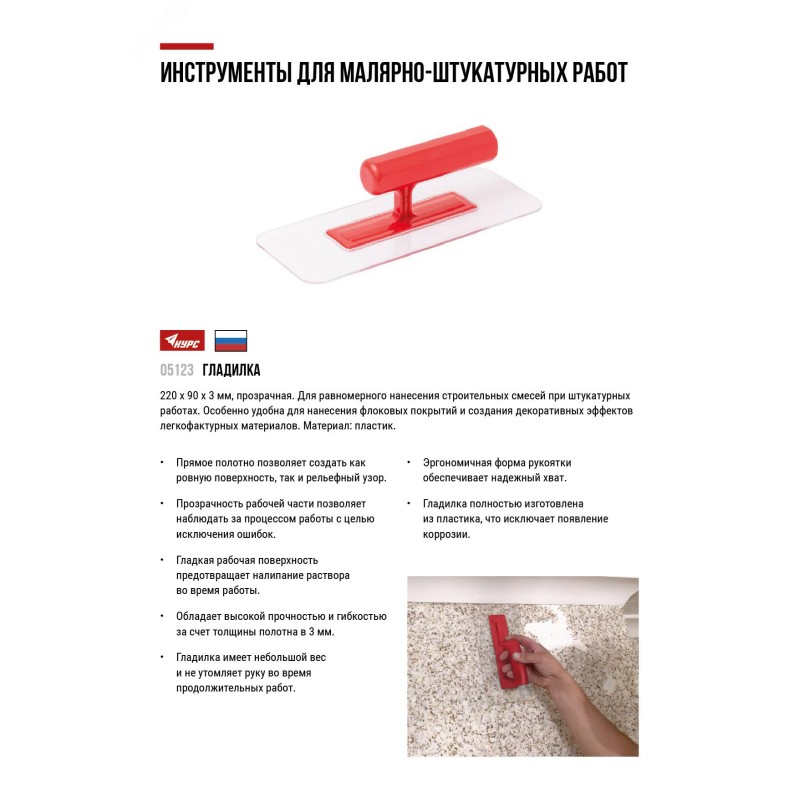 Пластиковая. Для равномерного нанесения строительных смесей при штукатурных работах. Особенно удобна для нанесения флоковых покрытий и создании декоративных эффектов легкофактурных материалов. Материал – пластик