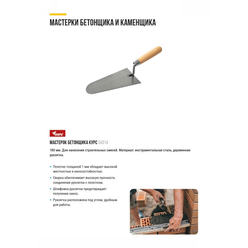 Мастерок бетонщика КУРС предназначен для нанесения строительных смесей. Полотно толщиной 1 мм выполнено из качественной инструментальной стали и обладает высокой жесткостью и износостойкостью. Сварка обеспечивает высокую прочность соединения рукоятки с полотном. Шлифовка рукоятки предотвращает получение заноз. Эргономичная форма рукоятки обеспечивает надежный хват.