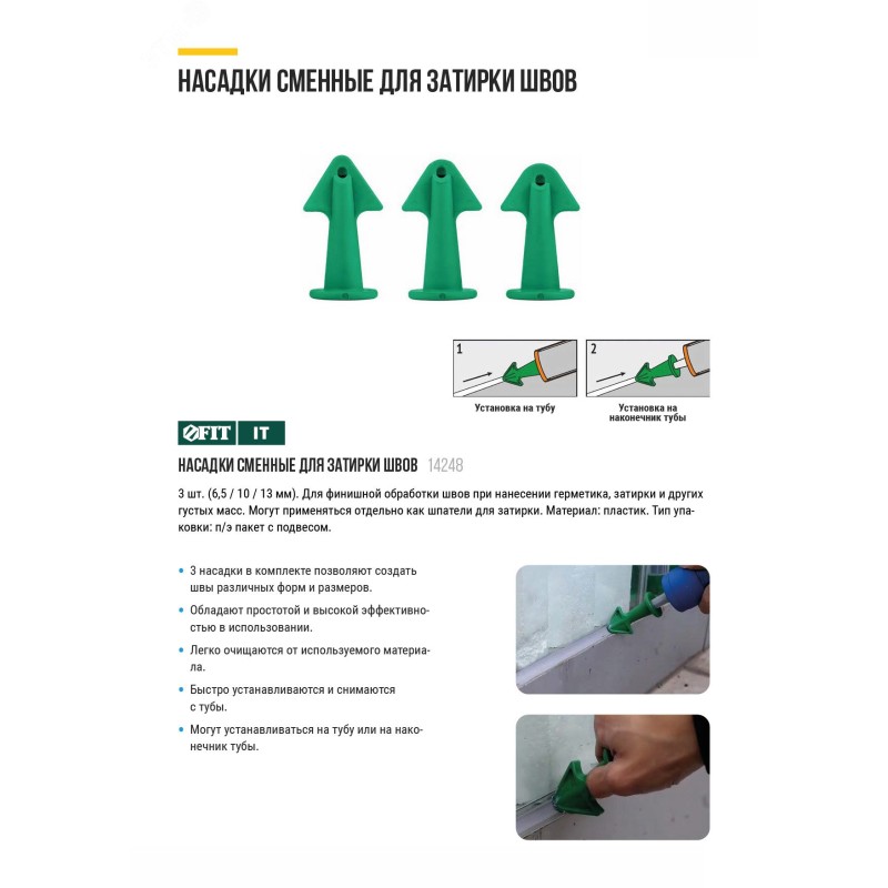 Для финишной обработки швов при нанесении герметика, затирки и других густых масс. Также отдельно применяются как шпатель для затирки. Материал – пластик. Упаковка – П/Э пакет с картонным подвесом.