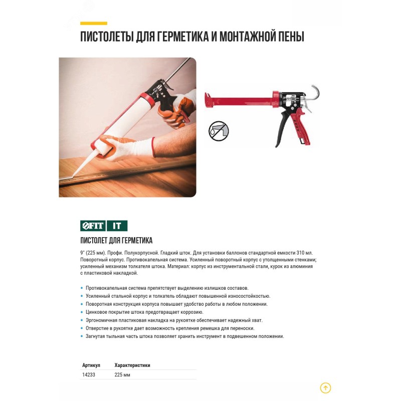 Профи. Для установки баллонов стандартной емкости 310 мл. Усиленная конструкция обладает длительным сроком службы и устойчива к деформациям. Противокапельная система предотвращает выделение излишков составов. Усиленный стальной корпус и увеличенная толщина толкателя для повышенной износостойкости. Поворотная конструкция повышает удобство в работе в любом положении. Цинковое покрытие шток предотвращает коррозию. Эргономичная пластиковая накладка на рукоятке.