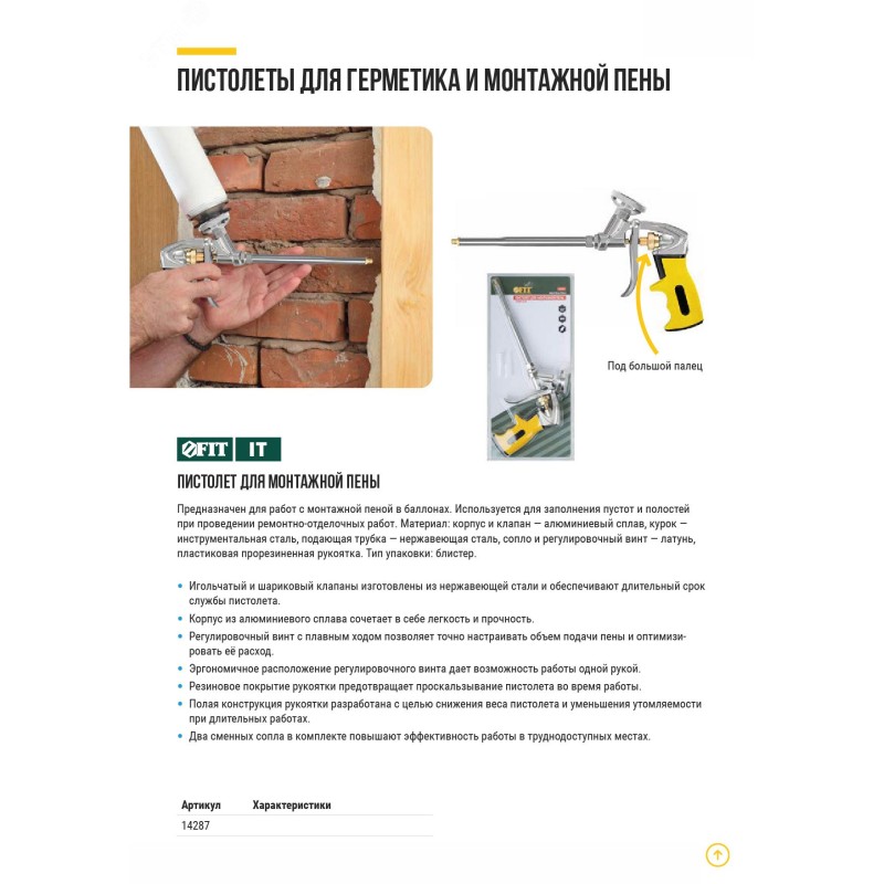 Применяется для заполнения трещин, стыков, полостей, отверстий при установке окон, дверных коробок и других строительных работах. Два сменных сопла в комплекте для работы в труднодоступных местах. Игольчатый и шариковый клапаны изготовлены из нержавеющей стали для высокой износостойкости. Регулировочный винт для точной настройки подачи пены. Эргономичное расположение регулировочного винта для работы одной рукой. Резиновое противоскользящее покрытие ручки. Полая ручка с целью снижения веса.