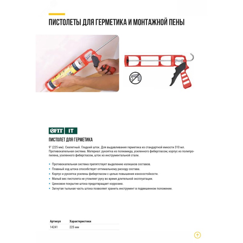 Предназначен для выдавливания герметика из стандартной тубы 310 мл. Скелетный. Противокальная система препятствует выделению излишков составов. Усиление фибергласом повышает прочность и износостойкость. Малый вес пистолета для снижения утомляемости. Цинковое антикоррозийное покрытие штока. Материал - рукоятка из полиамида, армированного фибергласом, корпус из полипропилена, армированного фибергласом, шток из инструментальной стали.