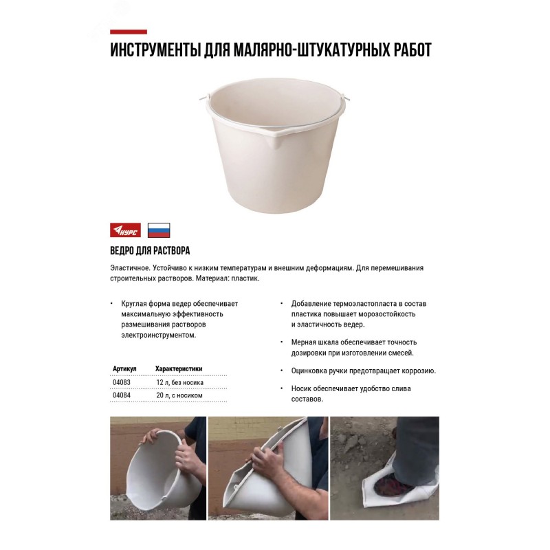 - Преимущества:круглая форма обеспечивает максимальную эффективность размешивания растворов|добавление термоэластопласта в состав пластика повышает морозостойкость и эластичность ведра