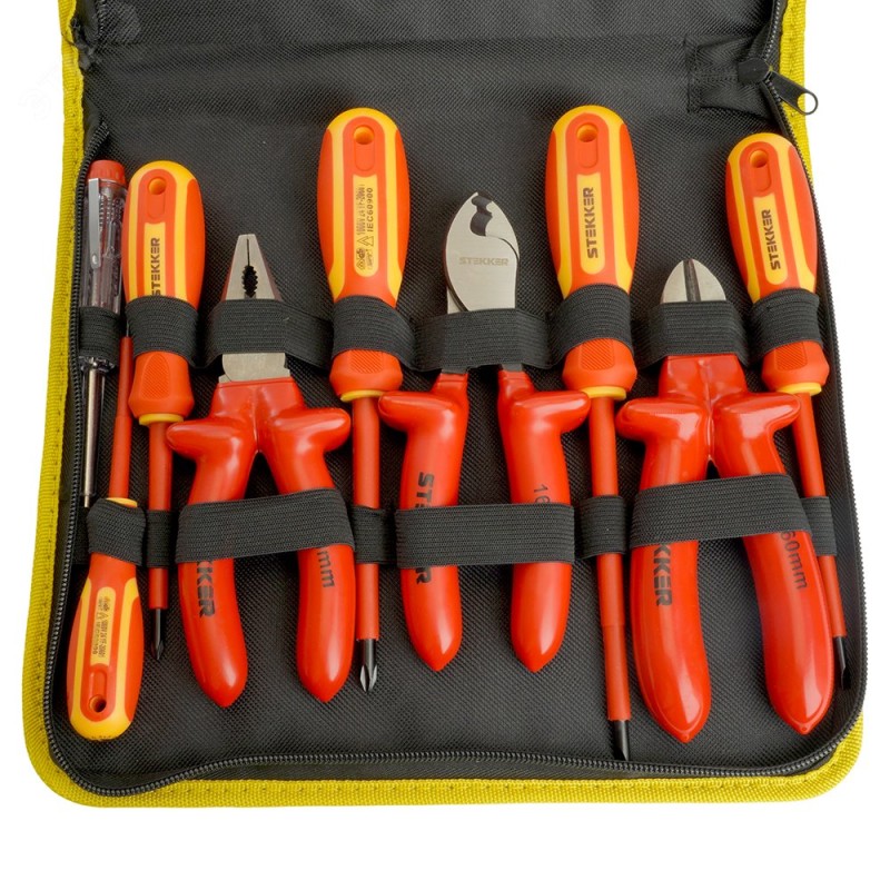 Набор из 9 инструментов STLS002. Набор предназначен для проведения слесарно-монтажных и ремонтных работ. Инструменты в наборе диэлектрические, с изолирующими рукоятками, безопасны при работе с электричеством и способны выдержать напряжение до 1000В. В комплект входят - отвертка шлицевая SL 3х75мм, отвертка шлицевая SL 4х100мм, отвертка шлицевая SL 5.5х125мм, отвертка крестовая PH 1х80мм, отвертка крестовая PH 2х100мм, плоскогубцы 160мм, бокорезы 160мм, тестер напряжения AC125-250В, 3х140мм, кабелерез 160мм.