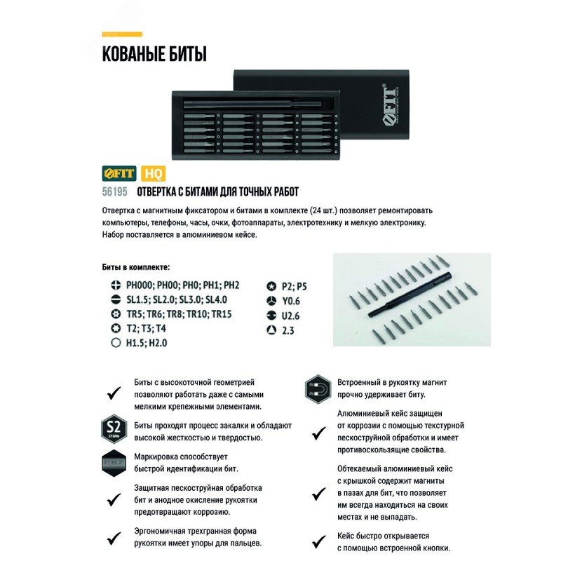 - Преимущества:биты с высокоточной геометрией позволяют работать даже с самыми мелкими крепежными элементами|биты из стали S2 проходят процесс закалки и обладают высокой жесткостью и твердостью|маркировка способствует быстрой идентификации бит|защитная пескоструйная обработка и анодное окисление рукоятки предотвращают коррозию|эргономичная трехгранная форма рукоятки имеет упоры для пальцев|встроенный в рукоятку магнит прочно удерживает биту|кейс защищен от коррозии с помощью пескоструйной обработки и имеет противоскользящие свойства|обтекаемый алюминиевый кейс с крышкой содержит магниты в пазах для бит, что позволяет им всегда находиться на своих местах и не выпадать|кейс быстро открывается с помощью встроенной кнопки