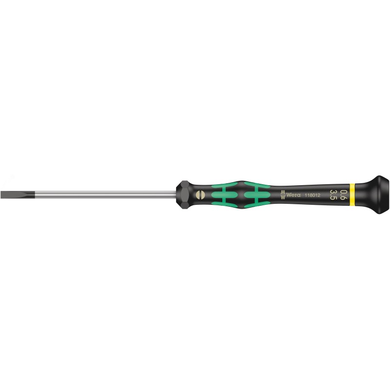 - Преимущества:Шлицевая отвёртка Kraftform Micro|Многокомпонентная ручка Kraftform Micro для быстрого и эргономичного завинчивания|С защитой от перекатывания и подвижной головкой для скоростного вращения|Наконечник Wera Black Point обеспечивает точность работы и оптимальную защиту от коррозии|С индикатором Take it easy - Цветовая маркировка профиля и гравировка размера