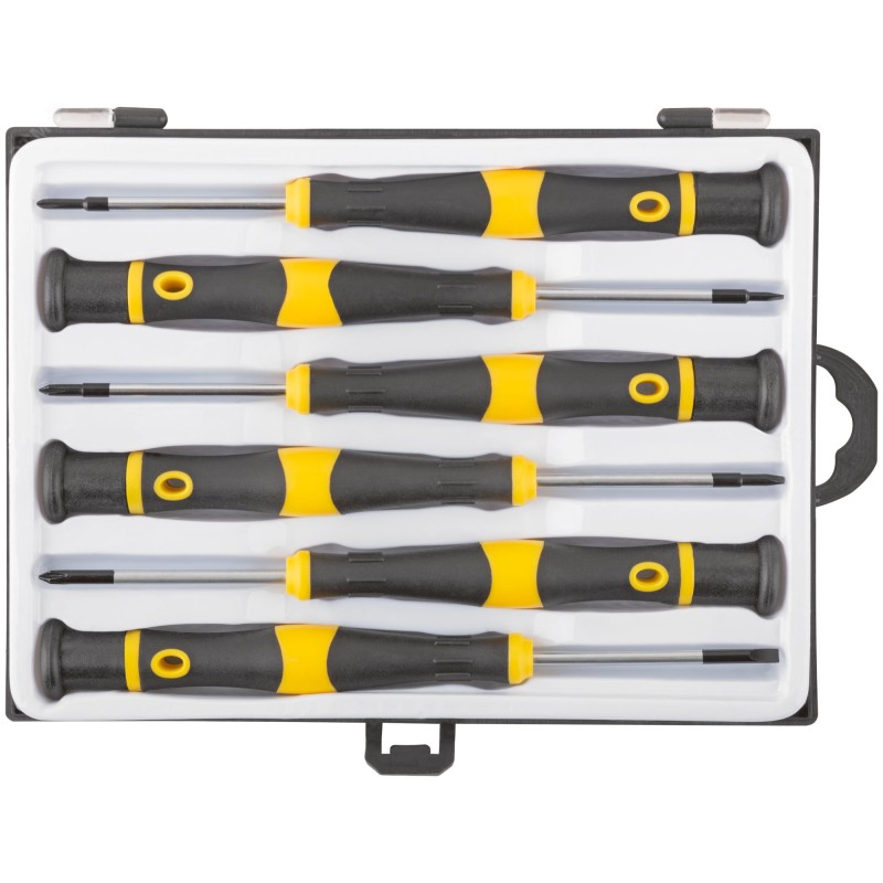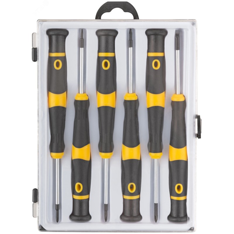- Преимущества:жало отверток изготовлено из термообработанной хром-ванадиевой стали и обладает высокой износостойкостью|наконечники намагничены с целью удержания крепежа и повышения комфорта в работе|никелевое покрытие жала предотвращает коррозию|резиновые вставки на рукоятках предотвращают проскальзывание во время работы|вращающийся упор на рукоятке упрощает процесс работы|пластиковый кейс обеспечивает организованное хранение и транспортировку