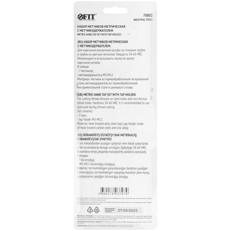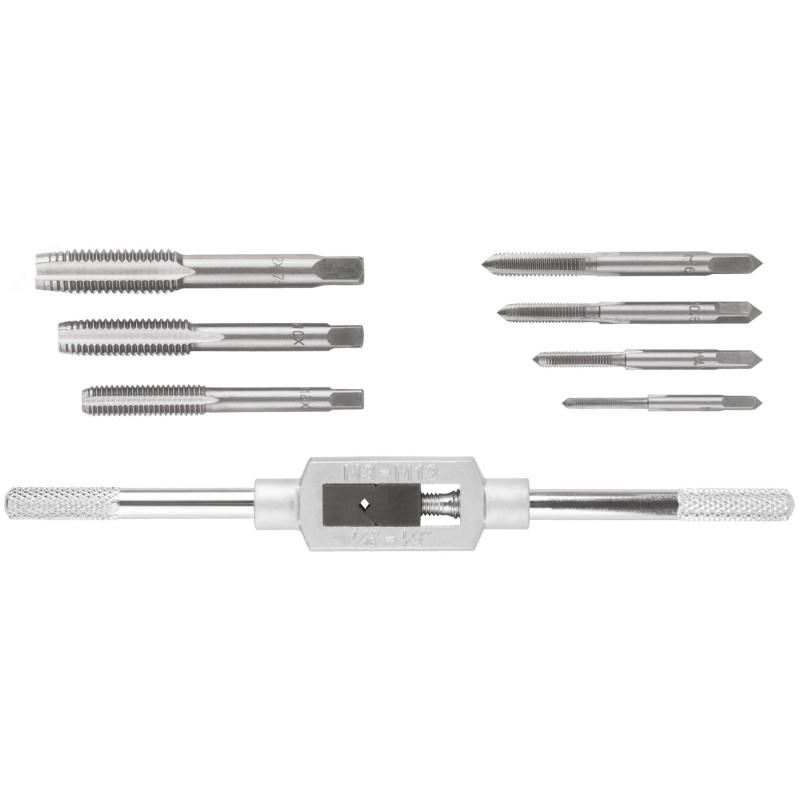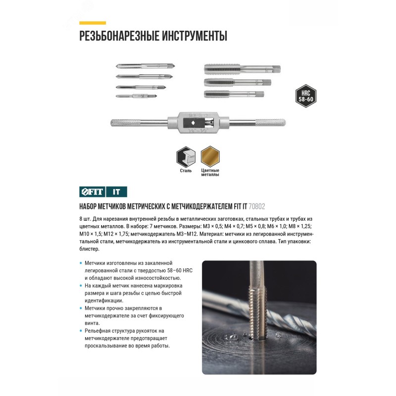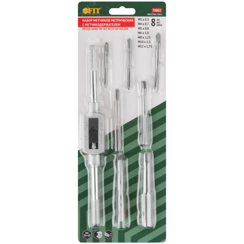 - Преимущества:Метчики изготовлены из закаленной легированной стали с твердостью 56-59 HRC и обладают высокой износостойкостью|На каждый метчик нанесена маркировка размера и шага резьбы с целью быстрой идентификции|Метчики прочно фиксируются в метчикодержателе за счет фиксирующего винта|Рельефное покрытие рукояток на метчикодержателе предотвращает проскальзывание во время работы