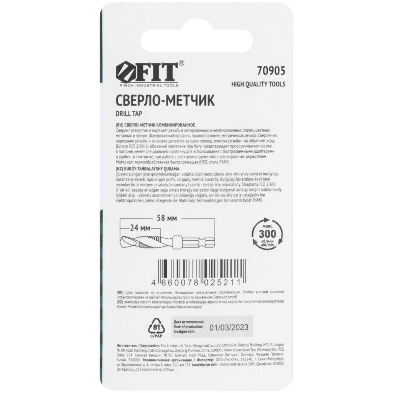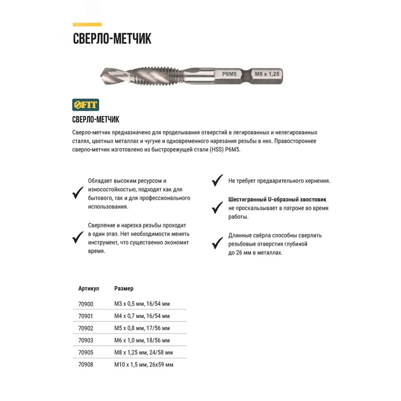 Сверло-метчик FIT HQ предназначено для сверления отверстий и нарезания резьбы в легированных и нелегированных сталях, цветных металлах и чугуне. Обладает высоким ресурсом и износостойкостью, подходят как для бытового, так и для профессионального использования. Сверление и нарезка резьбы проходит в один этап. Нет необходимости менять инструмент, что существенно экономит время. Не требует предварительного кернения. Шестигранный U-образный хвостовик не проскальзывает в патроне во время работы.