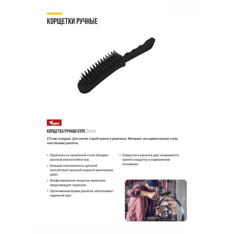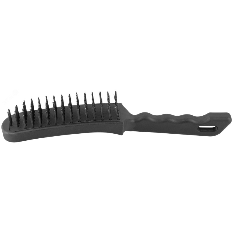 - Преимущества:проволока из закаленной стали обладает высокой износостойкостью|большая наполненность щетиной способствует высокой скорости выполнения работ|фосфатированное покрытие проволоки предотвращает коррозию|эргономичная форма рукоятки обеспечивает надежный хват|отверстие в рукоятке дает возможность хранить щетку в подвешенном положении