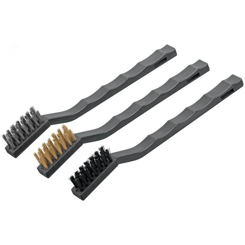 - Преимущества:оптимальны для тонких и точных работ|3 щетки с различными типами щетины позволяют выполнять широкий спектр задач на различных поверхностях|пластиковые ручки обеспечивают надежный хват|отверстия в ручках дают возможность хранения в подвешенном положении