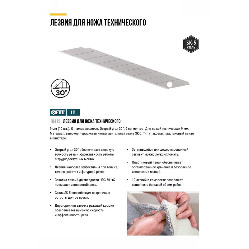 - Преимущества:острый угол 30° обеспечивает высокую точность реза и эффективность работы в труднодоступных местах|лезвия наиболее эффективны при тонких, точных работах и фигурной резке|закалка лезвий до твердости HRC 60–62 повышает износостойкость|сталь SK-5 способствует сохранению остроты долгое время|двусторонняя заточка режущей кромки обеспечивает высокую скорость и эффективность реза|затупившийся или деформированный сегмент можно легко отломать|пластиковый пенал обеспечивает организованное хранение и безопасное извлечение лезвий|10 лезвий в комплекте позволяют выполнить большой объем работ