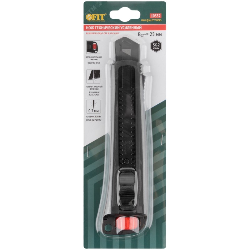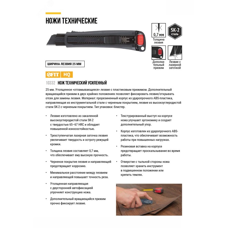 - Преимущества:лезвие из усиленной закаленной высокоуглеродистой стали SK2 с твердостью 65-67 HRC обладает повышенной износостойкостью|трехступенчатая лазерная заточка лезвия увеличивает твердость и остроту режущей кромки|толщина лезвия составляет 0,7 мм, что обеспечивает ему высокую прочность|черненое покрытие лезвия и направляющей предотвращает коррозию|минимальное расстояние между лезвием и направляющей повышает точность реза|утолщенная направляющая с двусторонней автофиксацией упрочняет конструкцию ножа|дополнительный вращающийся прижим прочно фиксирует лезвие|текстурированный выступ на корпусе ножа улучшает эргономику и создает дополнительный упор|корпус изготовлен из ударопрочного ABS-пластика, что обеспечивает возможность работы при повышенных нагрузках|резиновая вставка на корпусе предотвращает проскальзывание во время работы