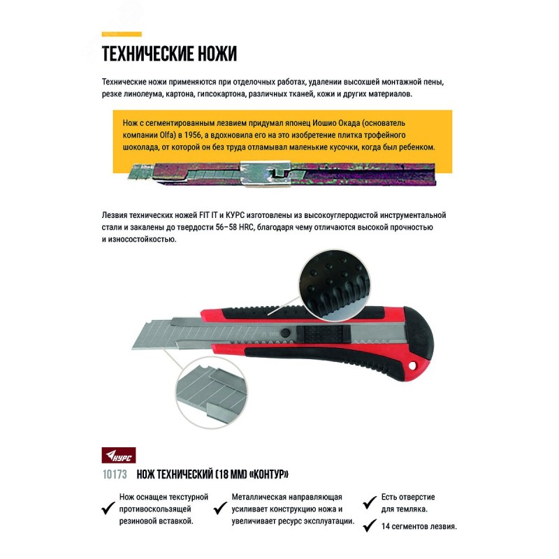 - Преимущества:лезвие ножа закалено до твердости 56-58 HRC и обладает высокой прочностью и износостойкостью|лезвие из высокоуглеродистой инструментальной стали позволяет резать широкий спектр материалов|двусторонняя перфорация направляющей повышает прочность фиксации|корпус с текстурированной резиновой вставкой предотваращает проскальзывание во время работы